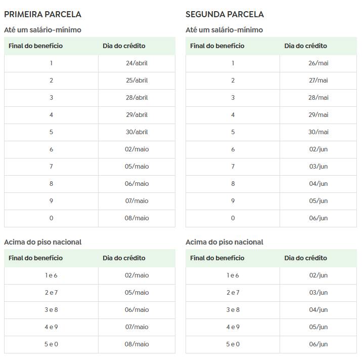 O calendário de pagamentos leva em conta o número final do cartão de benefício, sem considerar o último dígito verificador, que aparece depois do traço. O crédito da primeira parcela do abono será feito entre os dias 24 de abril a 8 de maio.